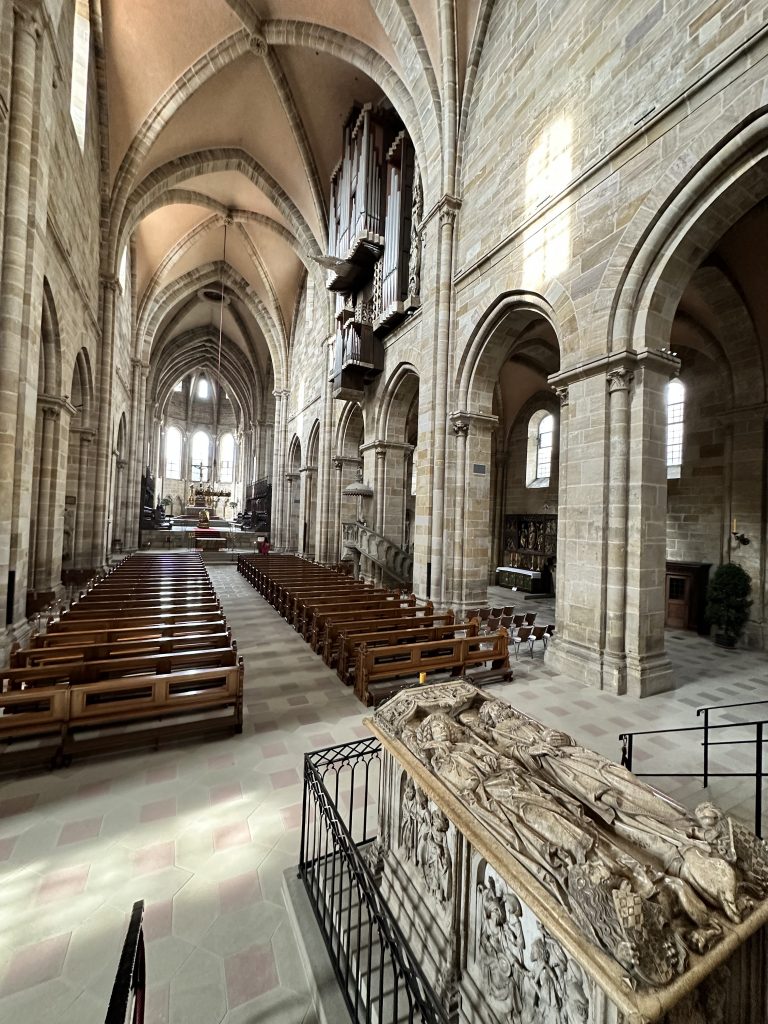 Die ehemaligen ottonischen Königsgüter in Quedlinburg oder Magdeburg waren die Erinnerungsorte für seine Vorgänger. Heinrich II. wählte Bamberg als den Ort seines Herzen. Allerdings war da außer einer Burg nicht viel. Ein kaum besiedelter Fleck. Dabei hätte es viele andere Orte im Reich gegeben. Als Herzog von Bayern residierte Heinrich in Regensburg (München gab es vor 1000 Jahren noch nicht), als König des Reiches verfügte er über viele Königsgüter. Aber er wählte einen bisher unbedeutenden Ort aus. Warum? „Persönliche Vorliebe, die man kaum erklären kann“, sagt Prof. Schneidmüller im Podcastinterview.