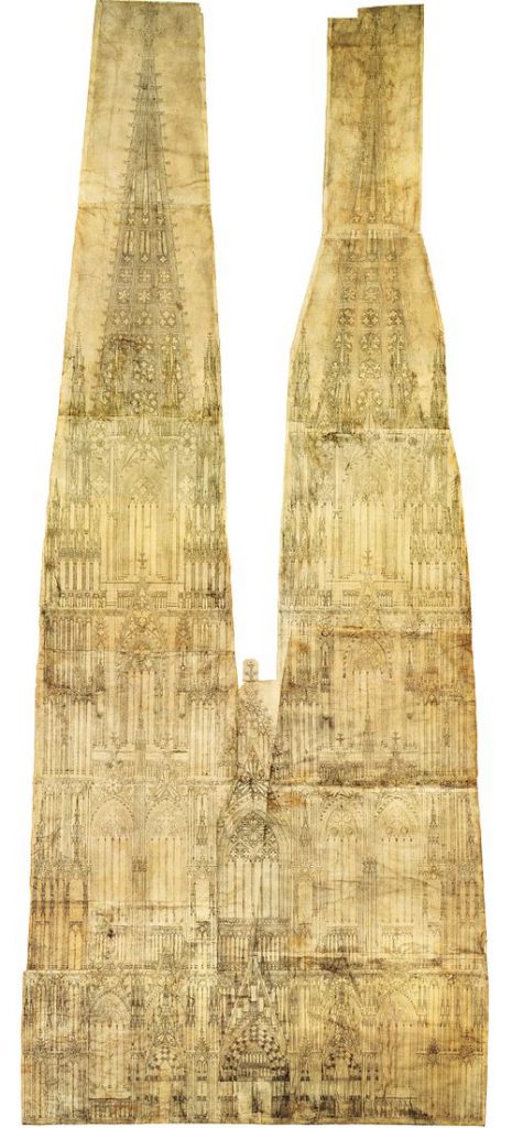 Erst ein halbes Jahrhundert später fertigte ein Nachfolger von Meister Gerhard den Fassadenplan F an. Auf 11 zusammengesetzten Pergamentbögen ist die damals geplante Westfassade des Kölner Doms maßstabsgetreu aufgezeichnet. 4 Meter hoch und 1,66 breit hängt er noch heute in der Johanneskapelle neben dem Beichtstuhl. Allerdings durch einen grünen Vorhang vor Licht geschützt.