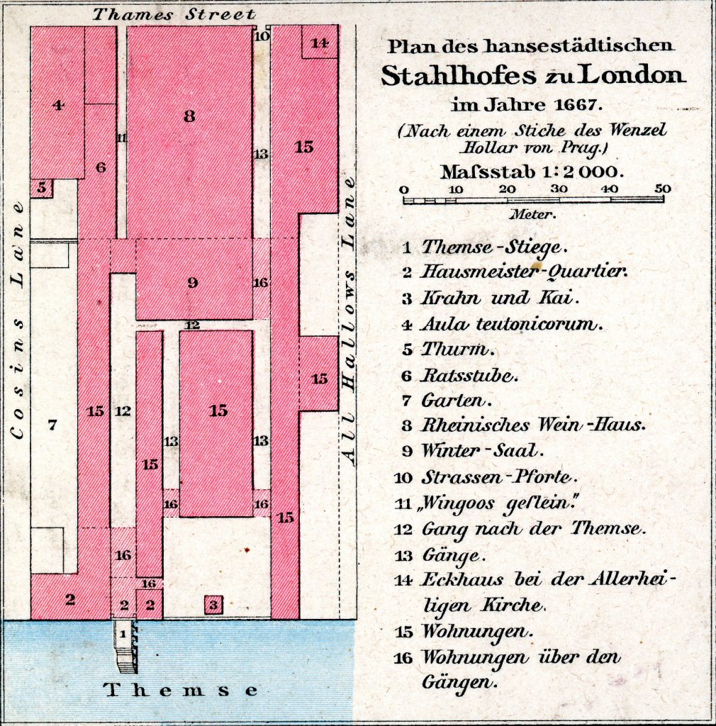 Der Petershof in Novgorod existiert leider nicht mehr. Auch der Stahlhof in London ist abgebrannt. Auch das Kontor in Brügge ist nicht mehr zu sehen. Das Bild links zeigt die Versammlungshalle des Hansekontors in Brügge. Rechts der Grundplan des Stahlhofes in London.