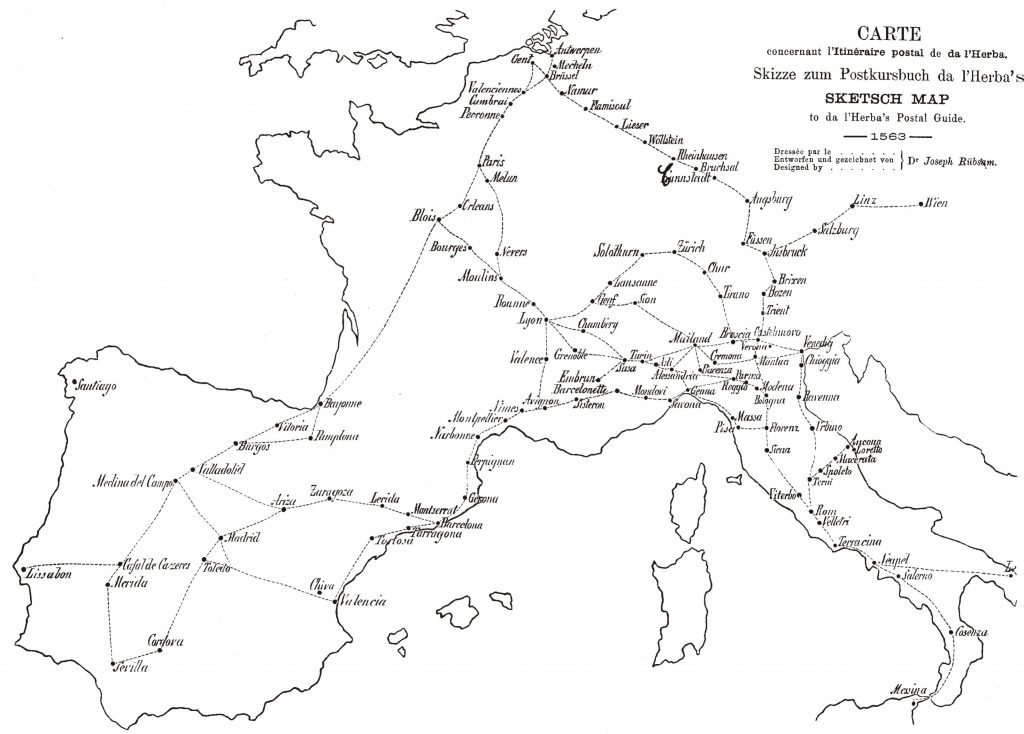 Um im ständigen Austausch mit ihr zu bleiben, bediente er sich eines besonderen Kurierdienstes. Er richtete zwischen Innsbruck und Brüssel die erste offizielle Postlinie der Welt ein. Betrieben wurde die Post von Francesco und Giovanni Baptista de Tasso. In der eingedeutschten Form: „von Taxis“. Ihre Innovation waren Poststationen außerhalb der Städte, die 24/7 im Einsatz waren. Schon wenige Jahrzehnte später breiteten sich Postlinien über ganz Europa aus.