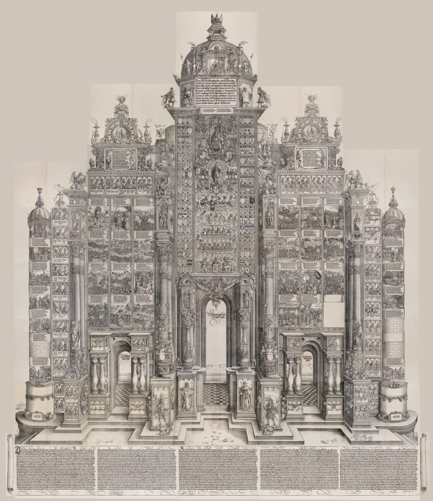 Auch Maximilian wollte etwas Bleibendes hinterlassen. Aber nicht in Stein, sondern auf Papier. Er beauftragte Albrecht Dürer einen Triumphbogen zu entwerfen, den er als Riesenposter (3 x 3,5 m) drucken und an 700 Gefolgsleute verschicken ließ.